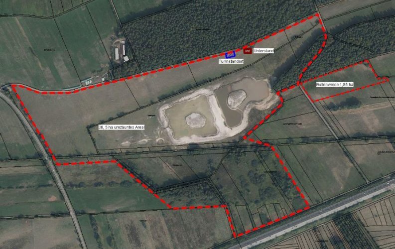 Am 11. Dezember 2020 waren dann die komplette Einzäunung für das rund 40 ha große Beweidungsareal um die Wasserflächen und weitere Beweidungsinfrastruktur wie der Unterstand fertiggestellt.